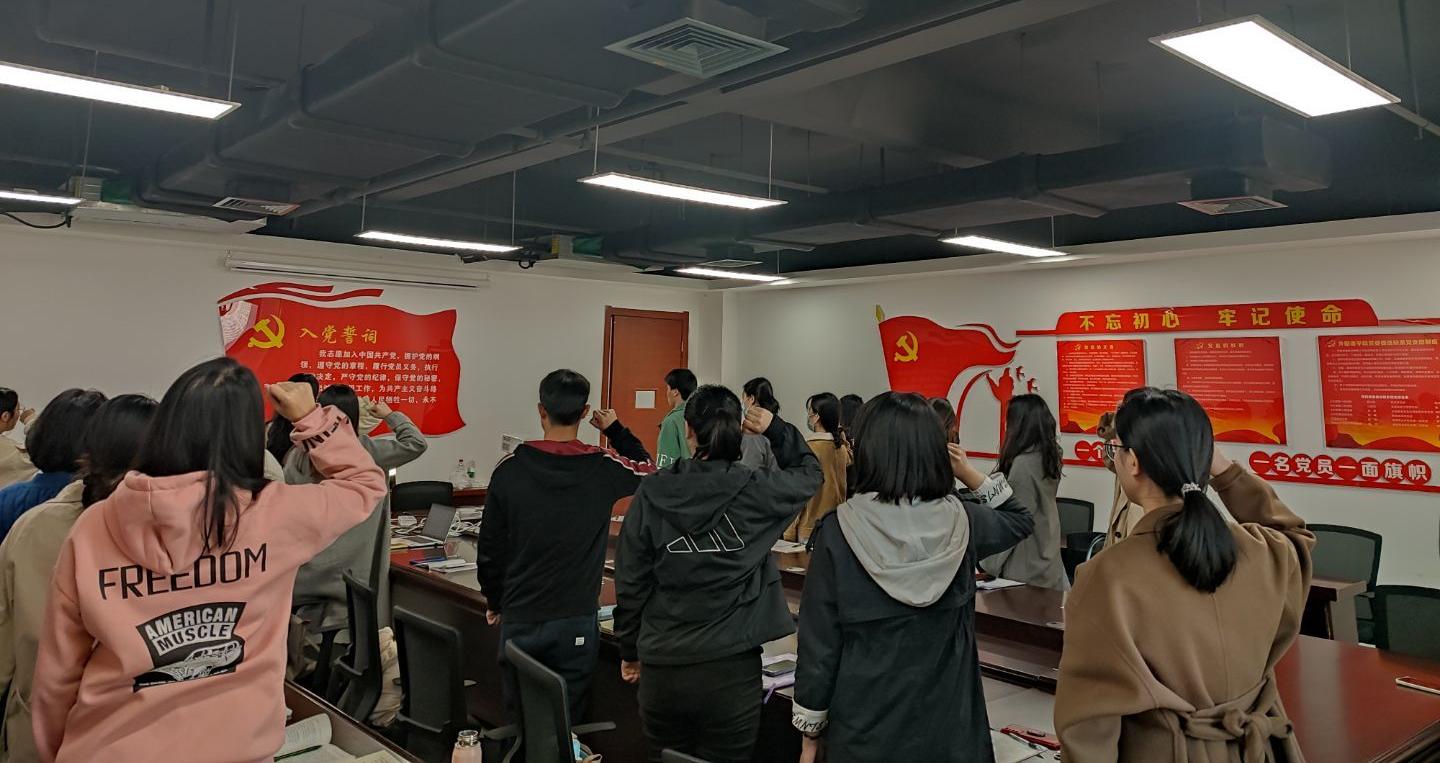面向鲜红的中国共产党党旗,全体支部党员同志举起右拳,重温入党誓词,铿锵有力的宣誓声响彻会议室。回顾建党历史,重温入党誓词,宣示我们坚定政治信念。